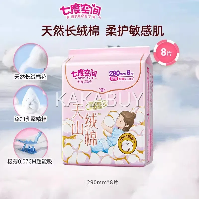 【3包】七度空间 少女系列 超柔纯棉卫生巾 超薄型超特长夜用 420mm*8片*3包入