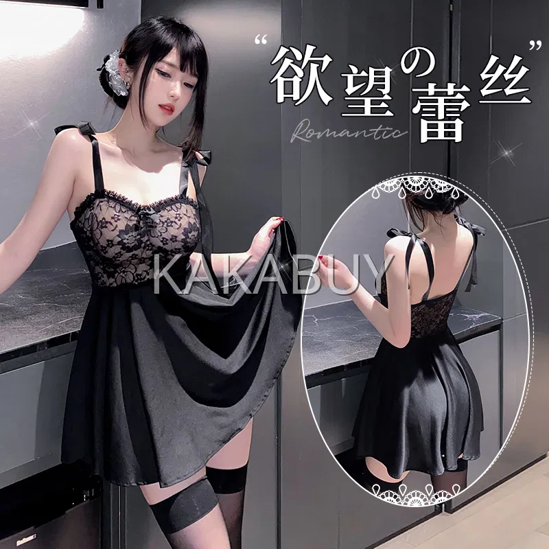 霏慕 镂空系带开裆爽滑连体衣套装 ZY65黑+7633白边黑耳发箍+7689白围裙