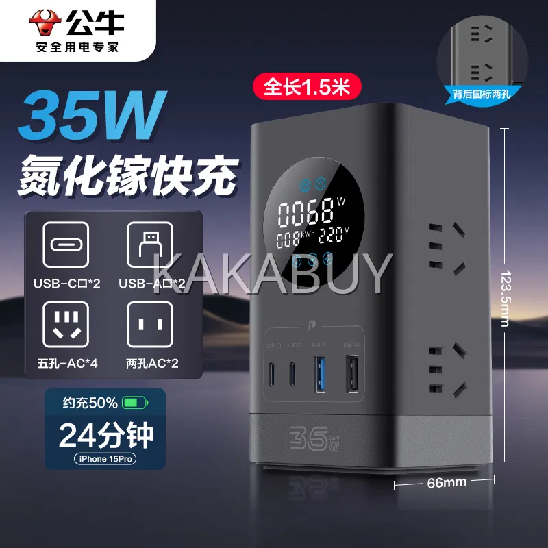 BULL公牛 65W快充魔方插座 3插位+1USB+2Type-C 总控 全长1.5m UU3653