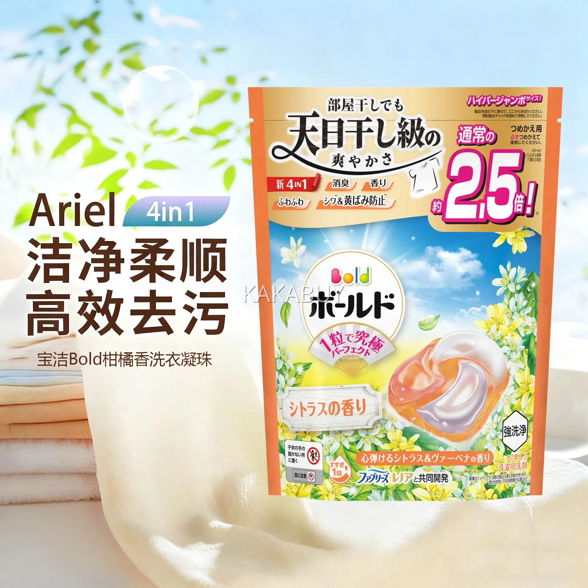 【加量袋装】日本P&G宝洁 Bold 4D凝珠洁净洗衣球 橙色柑橘香 27枚