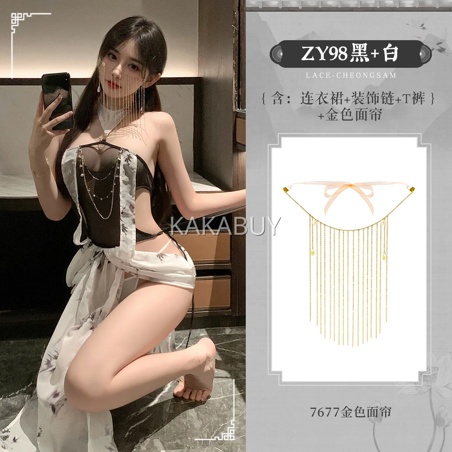 霏慕 大蝴蝶结掩胸开裆连体衣 6832+7202白长筒网袜 2色选