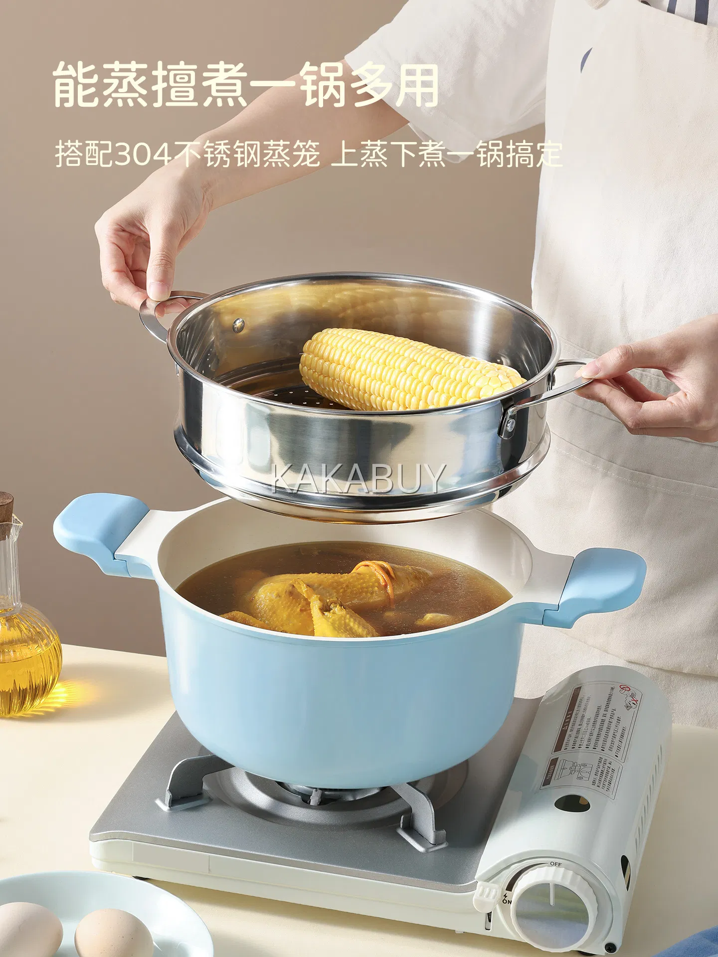 Carote卡罗特 304不锈钢木柄蒸锅 三层