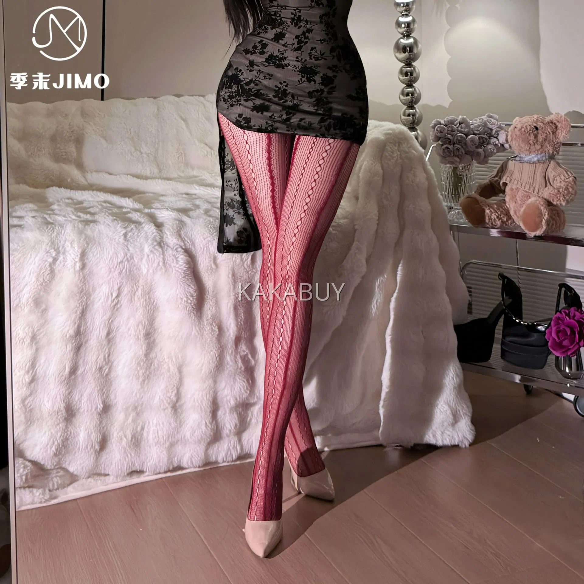 季末 紫鸳性感蕾丝挂脖包臀旗袍裙 9050+7135上红哑光丝袜