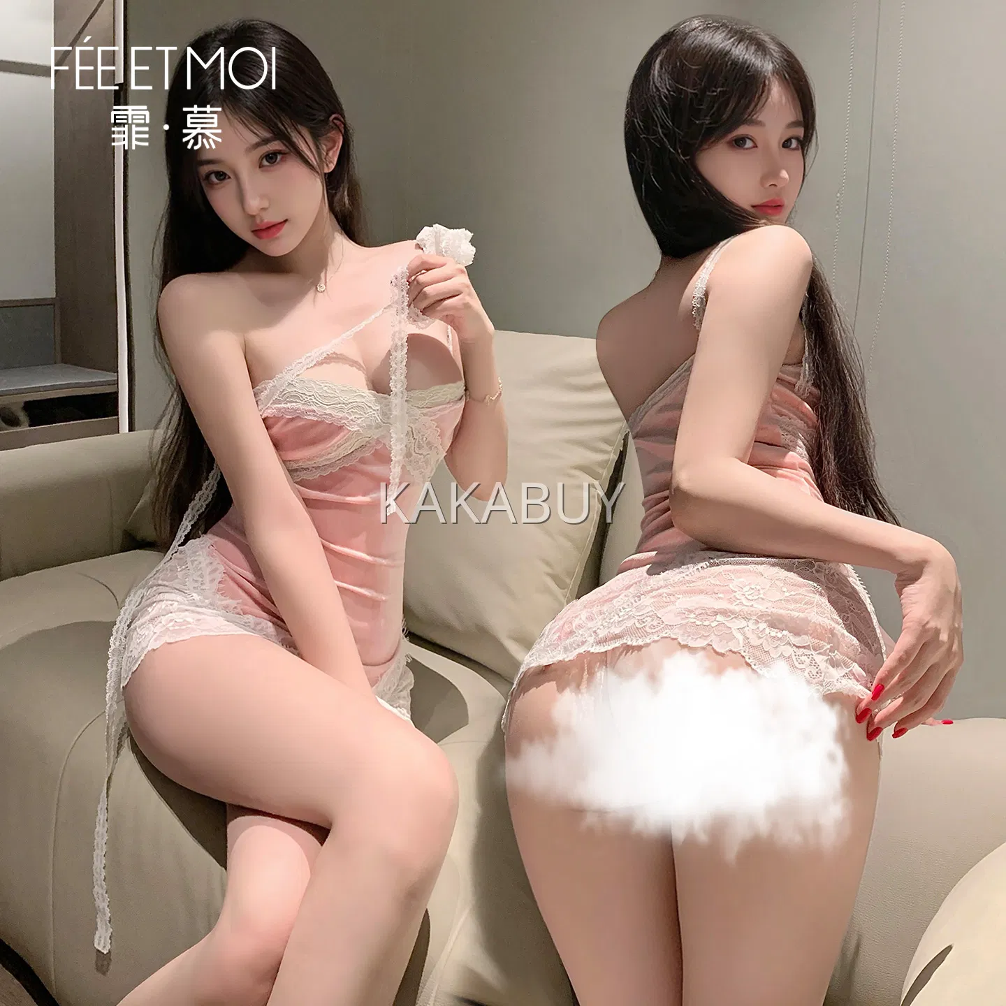 霏慕 蝴蝶结露胸开裆兔女郎 6312+7619粉乳贴+7204粉长筒网袜